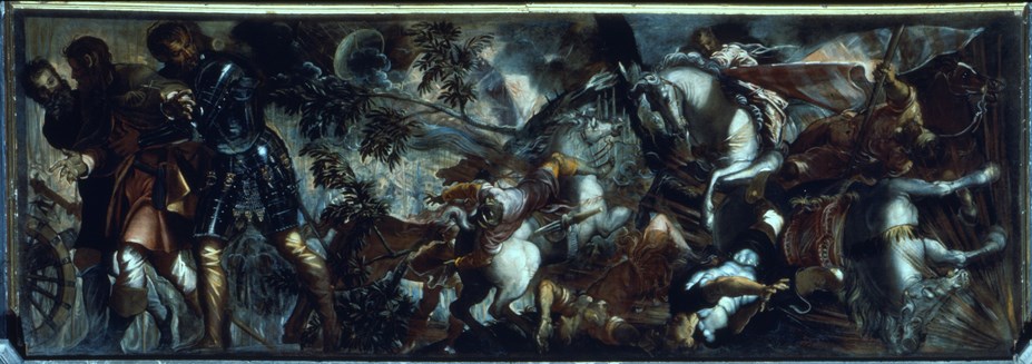 La prima, appesa alla parete laterale destra, è attribuita a Jacopo Robusti (Venezia, 1518 - ivi, 1594), più noto con il soprannome di Tintoretto, dai suoi contemporanei chiamato anche “il furioso” per la straordinaria rapidità di esecuzione che gli valse non poche accuse di superficialità e di concorrenza sleale da parte dei suoi colleghi pittori. Per brevissimo tempo allievo e poi grande rivale di Tiziano, fu interprete originale e innovativo della matrice manierista del XVI secolo, ponendo le premesse, secondo alcuni critici, per il futuro sviluppo del barocco. Di fronte a gran parte delle sue moltissime opere è impossibile non rimanere impressionati dalla veemenza scenografica della composizione, dalla tensione dinamica ed emotiva delle figure, dagli improvvisi squarci di luce tra le nuvole nere di burrasca…. Ora, di queste e di altre peculiarità espressive si ritrovano tracce poco convincenti nel quadro di cui si tratta, tanto che si pensa di intravvedervi un intervento tutt’altro che trascurabile dei collaboratori del maestro.