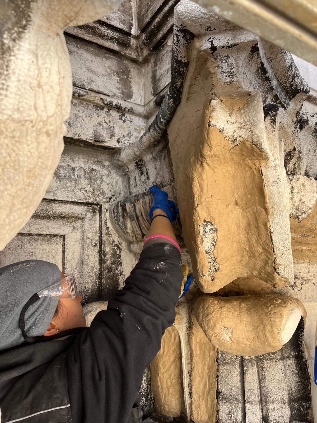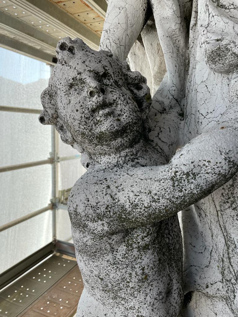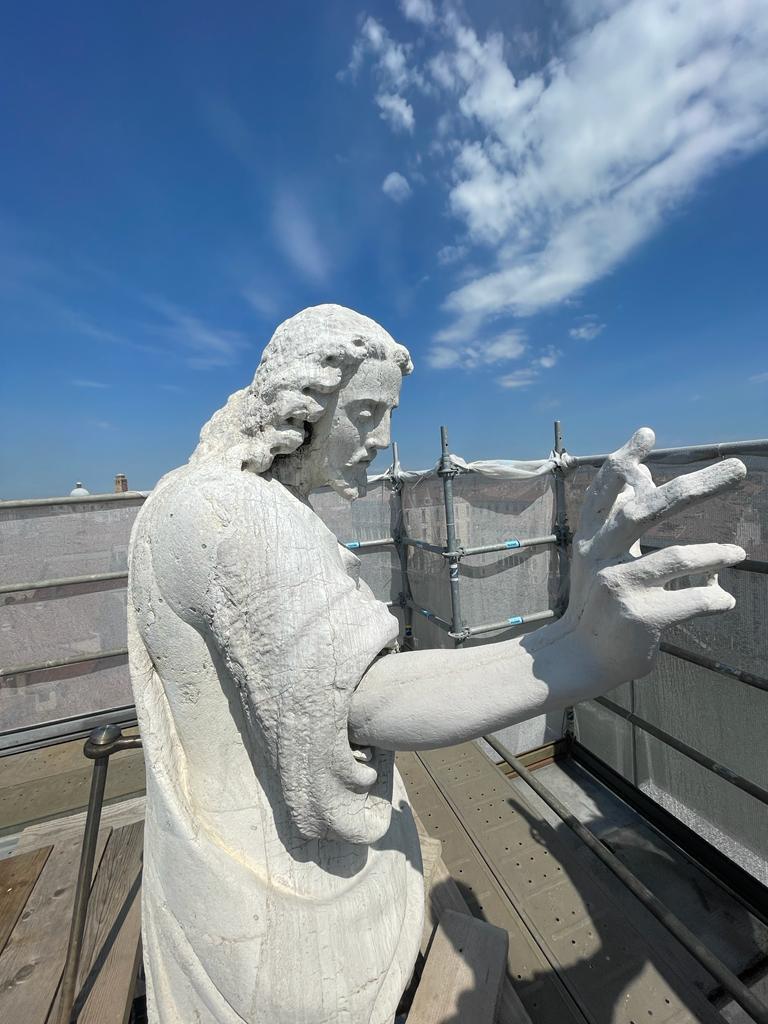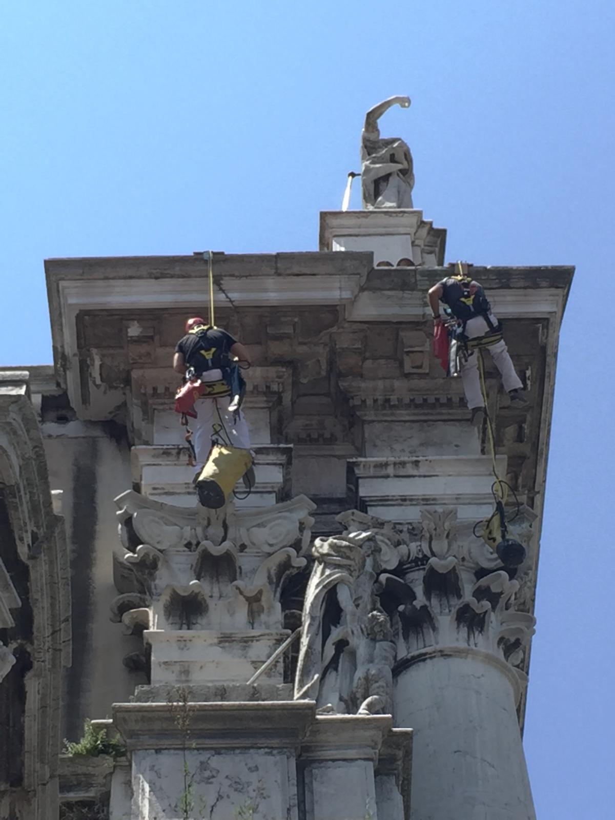La chiesa barocca di San Stae, affacciata su Canal Grande e opera dell’architetto Domenico Rossi (1657-1737) nato nel borgo ticinese di Morcote, è stato il primo edificio oggetto di un restauro totale da parte della Fondazione Svizzera Pro Venezia, inaugurato nel 1979 (si rimanda alla relativa scheda in questa stessa pagina del sito). Il passare del tempo e la mancanza di un’adeguata manutenzione hanno indotto la nostra Fondazione a considerare l’eventualità di un nuovo intervento, almeno relativo alla facciata della Chiesa, il cui stato di degrado appariva evidente. Tuttavia, l’incognita sull’effettivo stato dell’edificio e sulla fattibilità di un intervento, suggerirono alla Fondazione di assumersi gli oneri di un serio esame preventivo di questi aspetti, nonché del rilievo di tutta la chiesa, finora inesistente. Così, nel corso del 2020, la ditta incaricata poté in particolare esperire le indagini e il monitoraggio della facciata, procedendo altresì a una prima, urgente messa in sicurezza non solo delle parti danneggiate del tetto e della copertura della torre campanaria, ma anche di componenti dell’apparato decorativo della facciata. Queste operazioni sono state effettuate con l’impiego di restauratori su fune, documentate da un interessante servizio della RSI (si rimanda al proposito alla pagina “link utili” di questo sito). La relativa relazione tecnica rivelò un importante stato di degrado, soprattutto -per quanto concerne la facciata- evidenziando numerosi danni, come il distacco di cornici, di elementi decorativi, di parti di statue e di copertine, dissesti di parti architettoniche, di intonaci e di elementi lapidei, ma anche scagliature della pietra, fessurazioni, erosioni, nonché la presenza di macchie, di micro e macroflora. Il restauro della facciata e diverse riparazioni del tetto, parimenti evidenziate dalla relazione tecnica, furono pertanto ritenute imprescindibili.