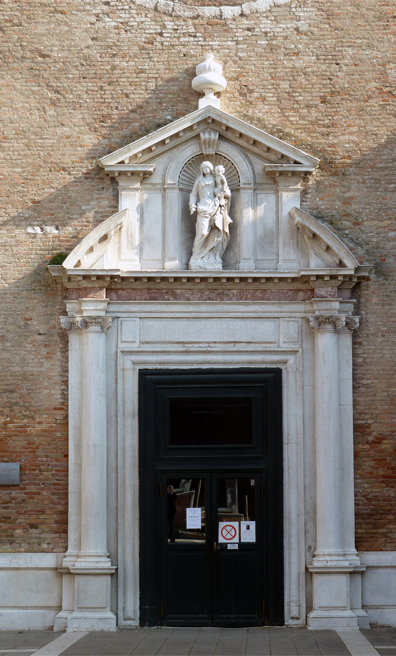 Percorrendo le calli veneziane, sovente ci si trova a passare nell’animato campo S. Margherita e a soffermarsi incuriositi ad osservare l’ingresso laterale della chiesa di S. Maria del Carmelo (vulgo Carmini), che delimita un lato del campo. Tale ingresso è sormontato da una singolare copertura in pietra, a sbalzo, detta protiro, che sorprende sia per l’arditezza della costruzione che per la decorazione con fregi e patere raffiguranti un bestiario affascinante. Ma basta proseguire verso la facciata principale della chiesa per cambiare registro e osservare, nella sobria facciata di ispirazione codussiana un tempo intonacata e arricchita soltanto da un rosone e cinque statue sommitali, il portale principale, a prima vista di fattezze rinascimentali. Il portale (in pietra d’Istria, costituito da due semicolonne e lesene angolari di un raffinato ordine ionico su alti basamenti, reggenti una trabeazione a dentelli e fascia in marmo rosso -unica nota di colore e variazione materica del portale- e una edicola con timpano spezzato ad esse raccordata tramite segmenti d’arco) accoglie al centro una statua a tutto tondo della Madonna con il Bambino, sormontata da un vaso (in origine invece dovevano esserci tre statue sulla sommità del portale, mentre è stata appurata la posizione non originaria della statua della Madonna).